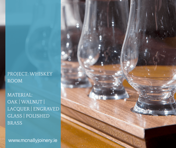 McNally Joinery had the pleasure of working with the ‘The Whiskey Room’ at Airport View Hotel to create a vintage look for their whiskey room in addition to the McNally Joinery restaurant doors. The client had a very specific idea about what they wanted for the Whiskey Room. We crafted solid oak doors, with an oval vision panel and glass engraved with the whiskey room’s chosen font. Large polished brass handles completed the look. We created solid walnut whiskey flights for tastings which were routed to hold whiskey glasses and an extensive whiskey menu.