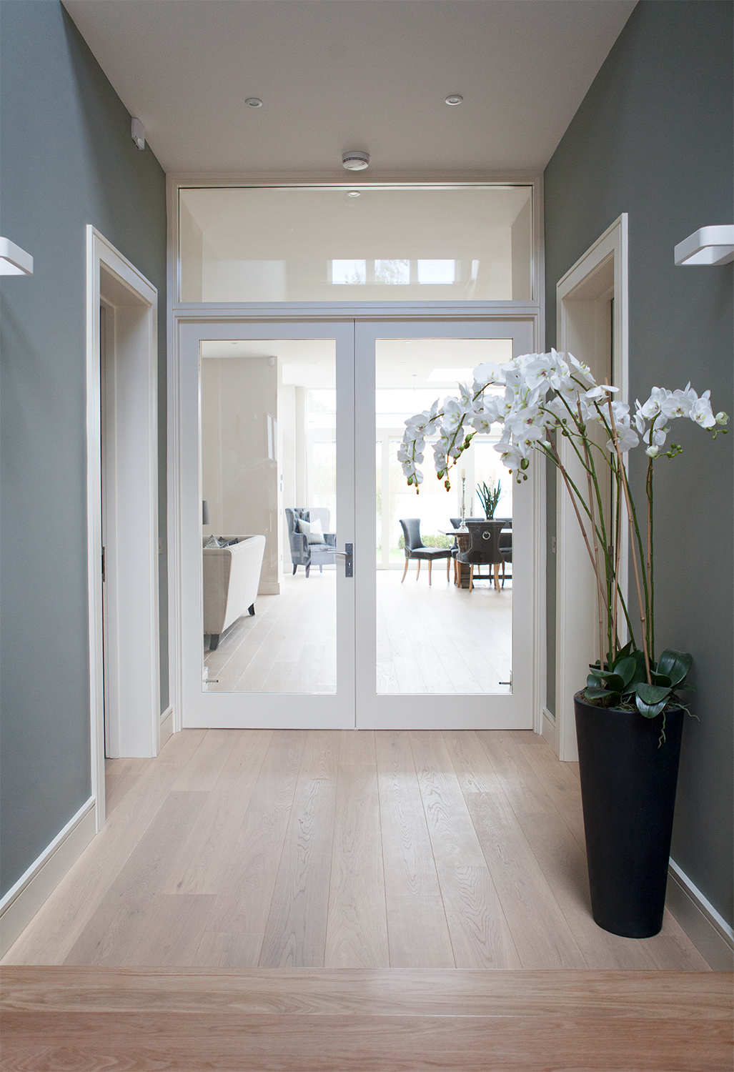Double doors and fanlight - hallway transom view - glass door - white door frame - tall orchid