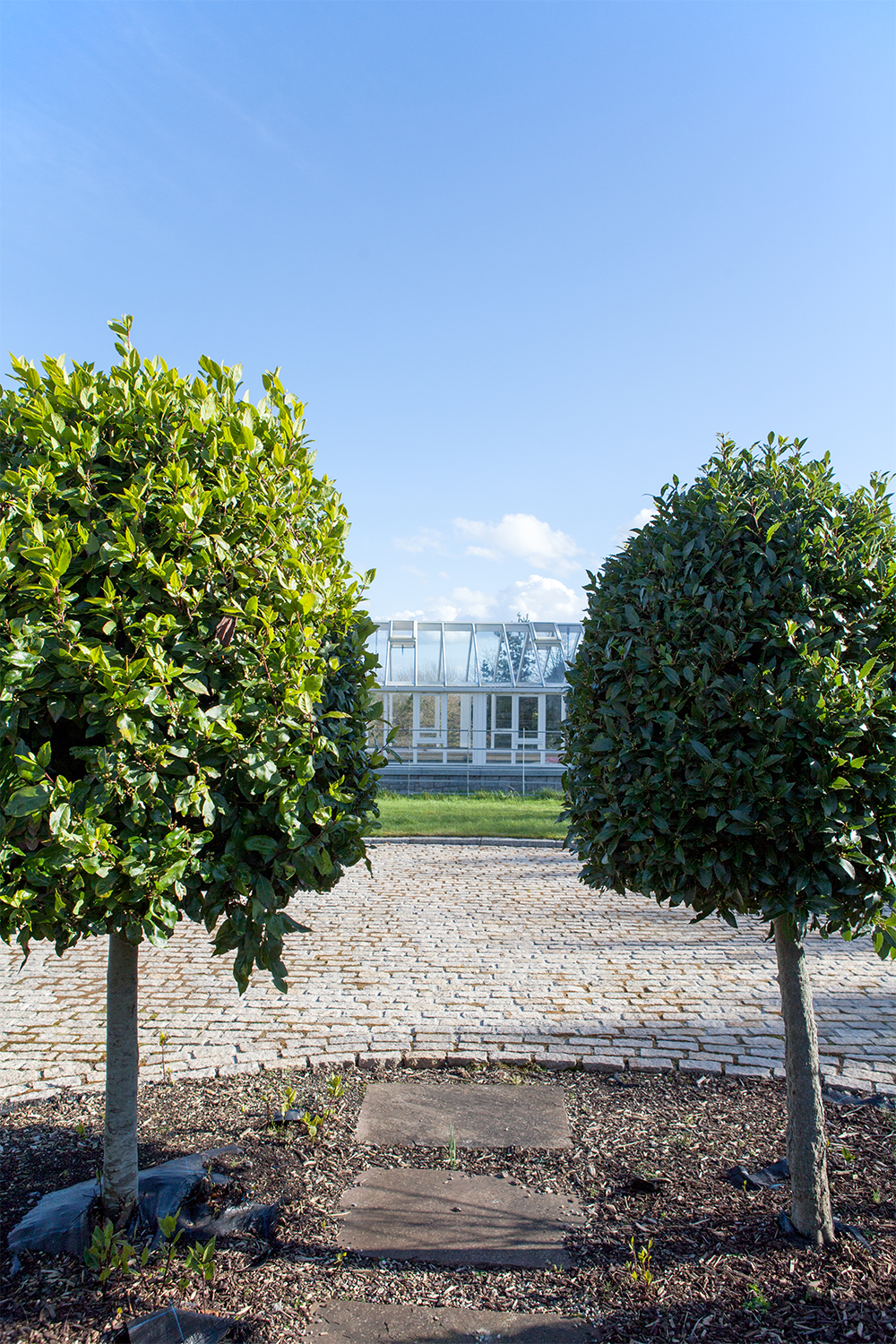 view of glasshouse through two hedge tree's - pathway and stone driveway