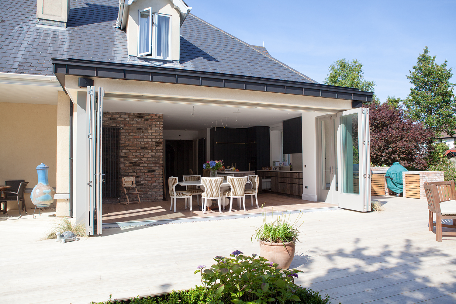 Accoya | RAL 7030 to outside | Grey to Inside | Centor E3 Sliding Gear | Seven Folding Leaves | Shaker Style Doors | Satin Chrome Fab and Fix Handles