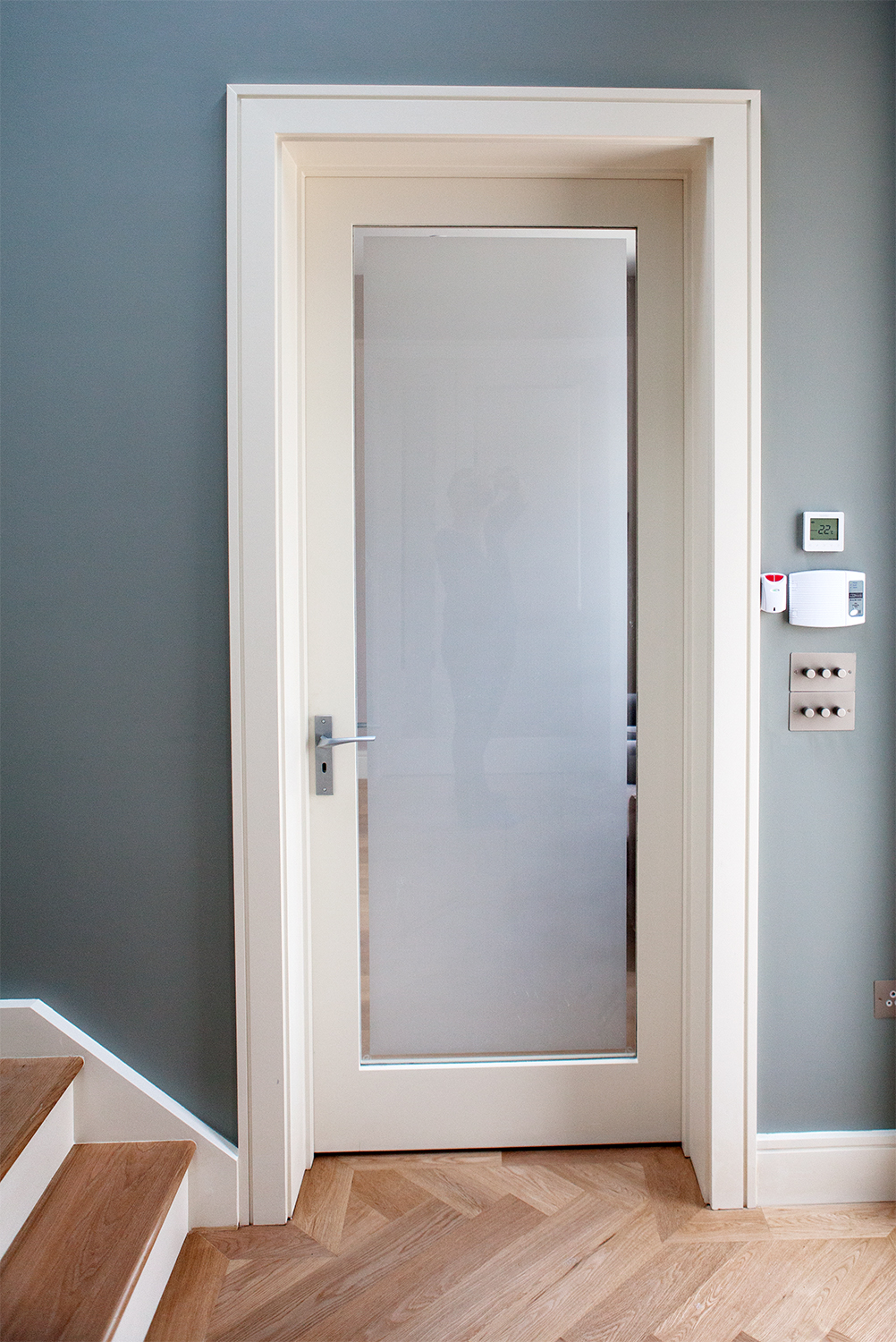 Internal door and frame with sandblasted glass - white door frame and casing