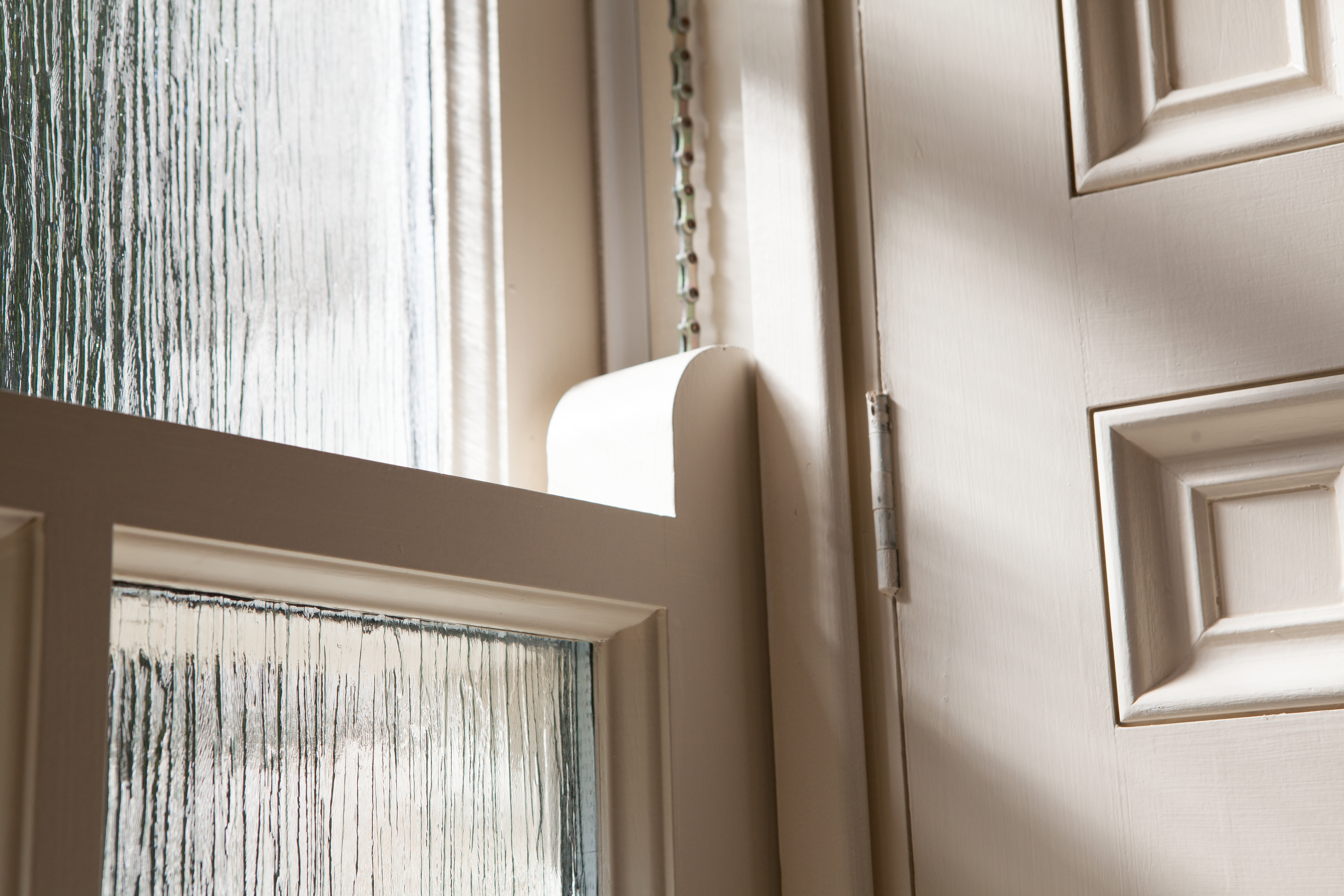 Sliding sash bathroom window with cotswold glass - white frame and casing