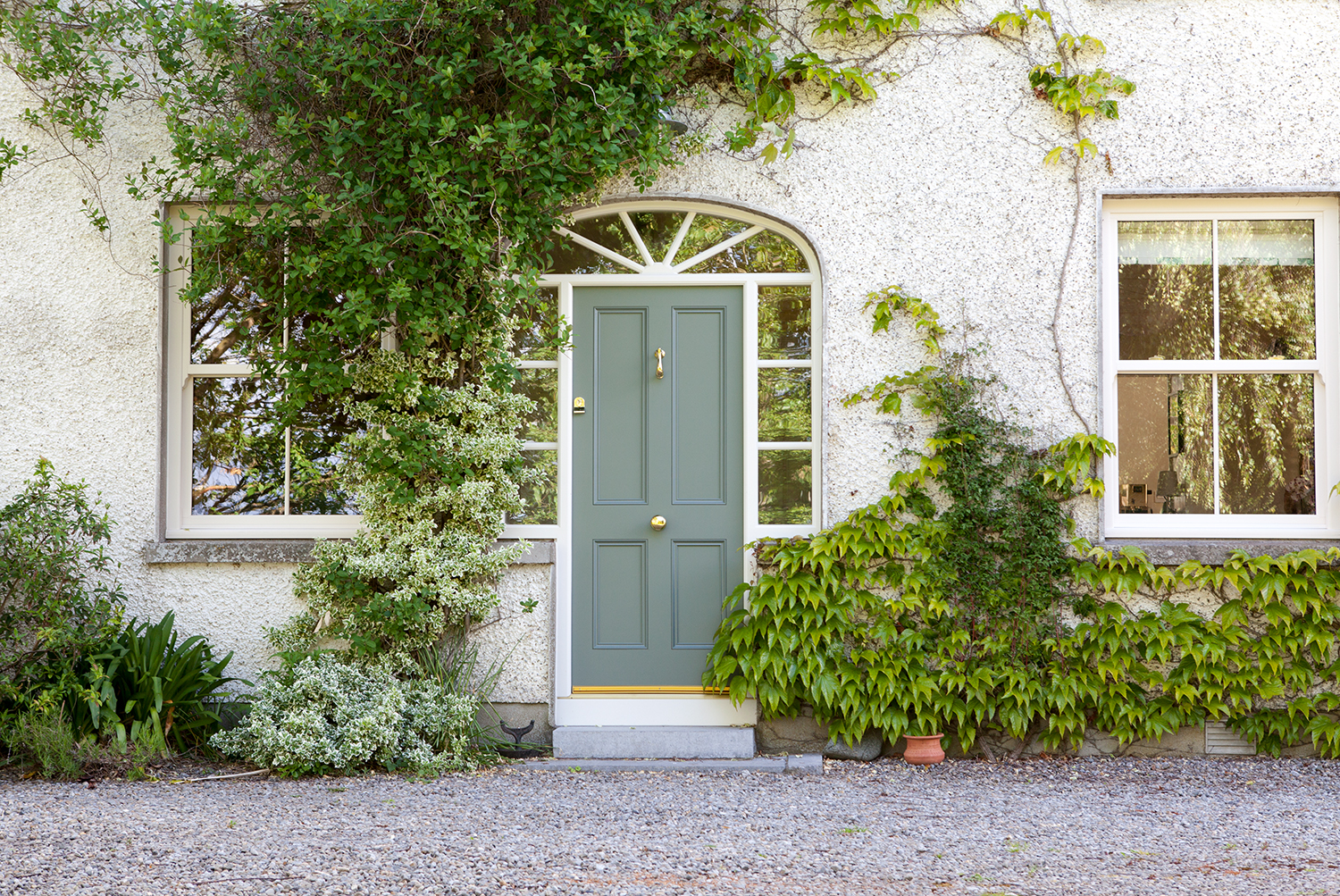 Four panel door with arched fanlight and half height screen