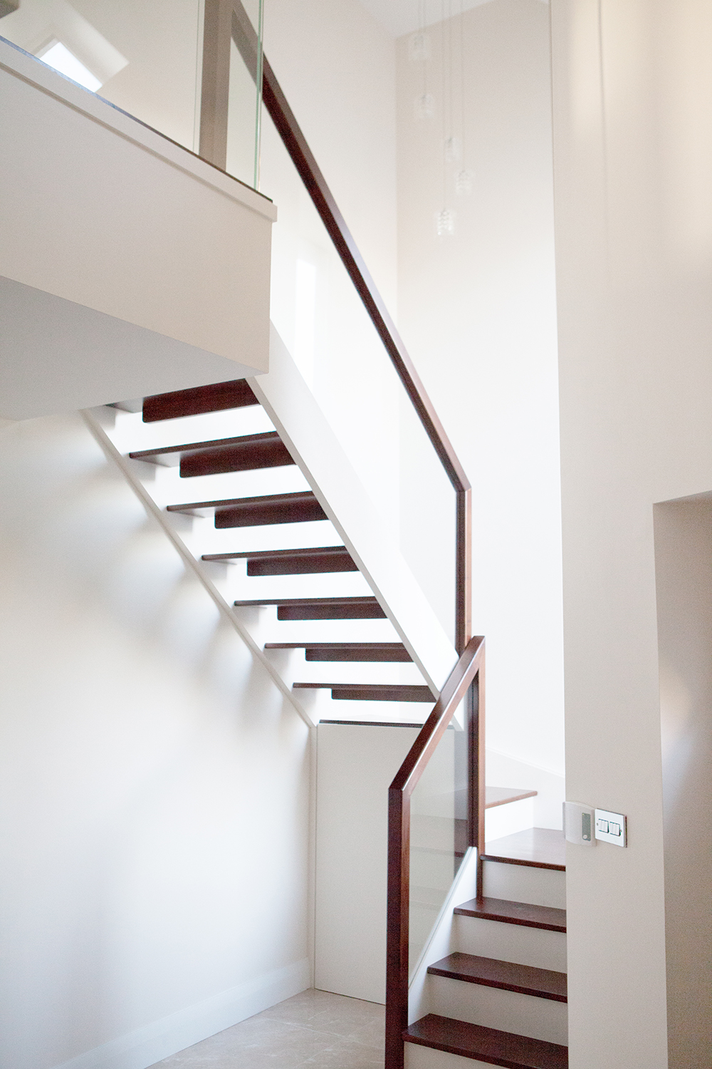 Modern style Walnut | Cream Strings | Glass Balustrade | Downstand Riser | Winderbox | Square Handrail Like Loading...