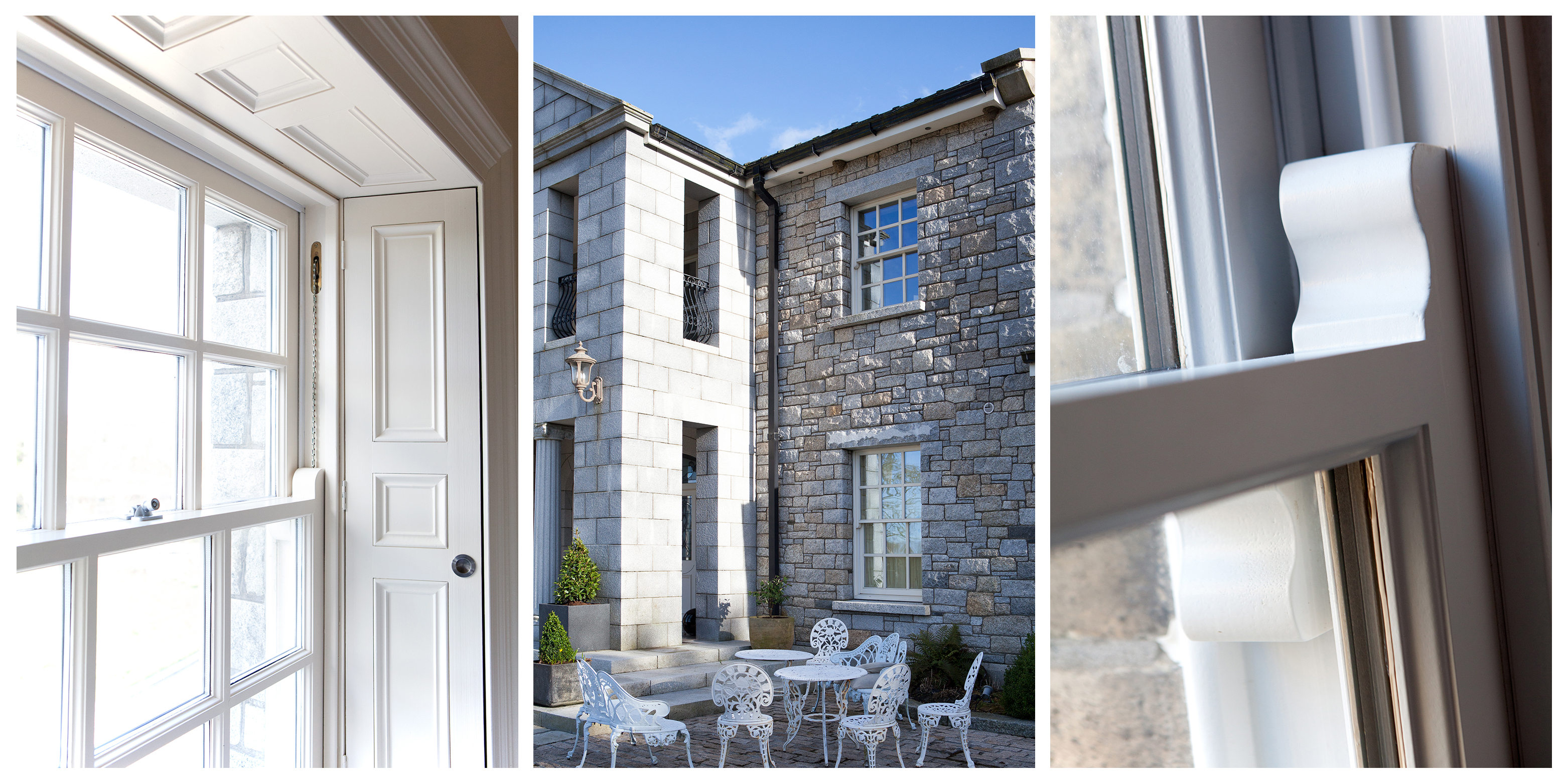 Iroko Teak | McNally Cream Finish | Weights and Cords | Shutters | Matching Overhead Panel | Individual Glass Panes; 6 over 6 | Traditional Satin Chrome Catches